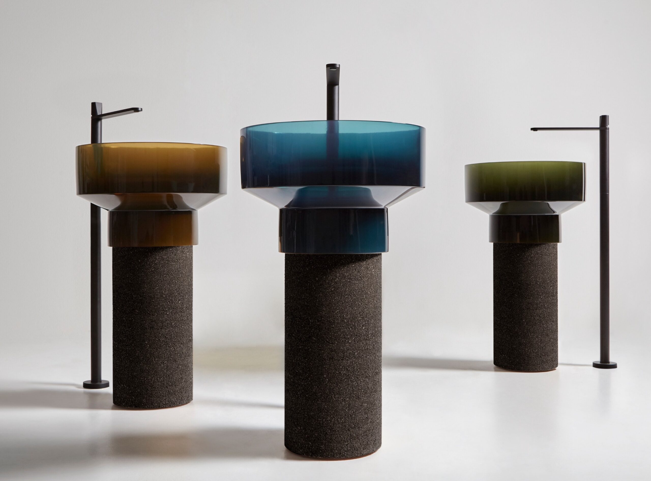 “La experimentación material y la tradición italiana se unen en una combinación original en esta línea de lavabos de pie. La peculiaridad es la base de corcho, natural o tostado, que soporta los lavabos en Cristalmood, una resina transparente patentada por la marca. La línea está firmada por los toscanos Gumdesign, alias Laura Fiaschi y Gabriele Pardi, que se inspiran en Bolgheri, la encantadora ciudad de la Maremma, para los matices Gran Cru, Oleo y Ceruleo que recuerdan los colores de los olivos, el vino y el mar. . »